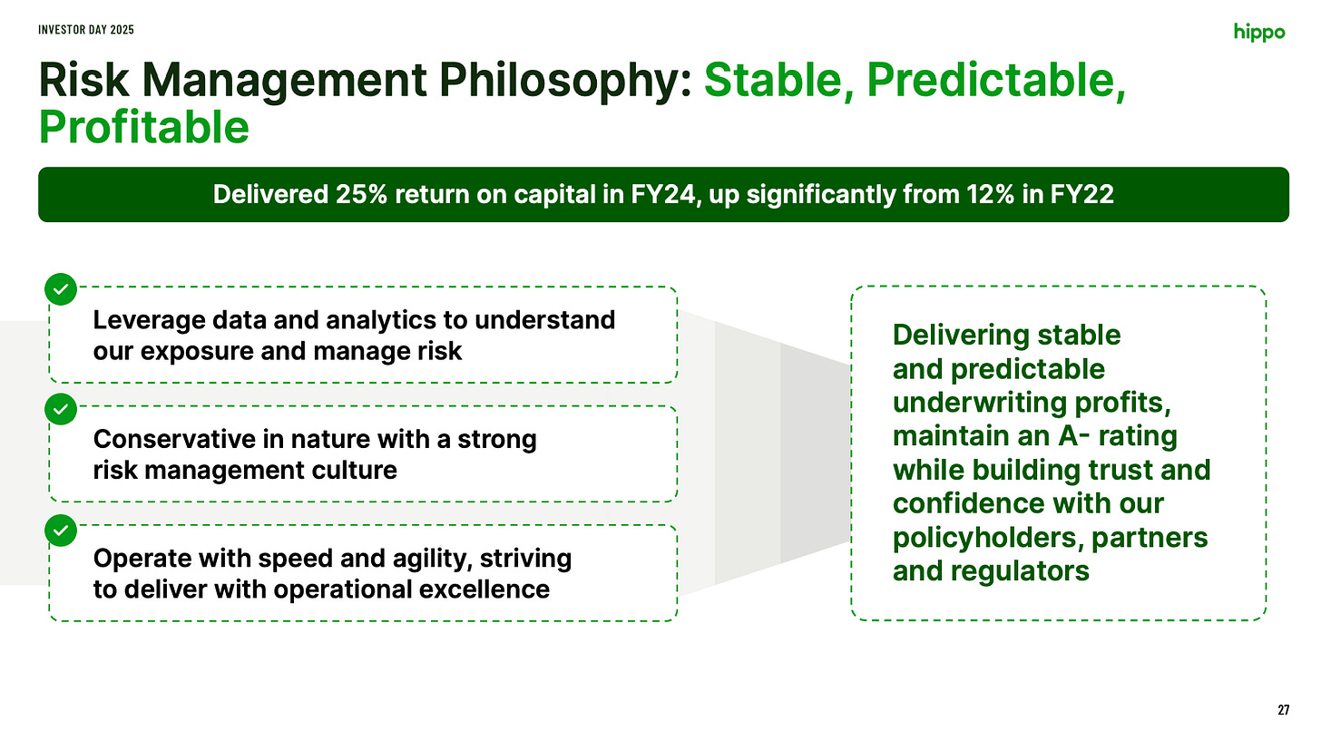 Behind the scenes, Spinnaker Insurance gives Hippo full control of its capacity, reinsurance, and product structure. Most insurtechs lease capacity; Hippo owns it. That vertical integration creates a feedback system between underwriting, claims, and reinsurance optimization: effectively a self-reinforcing data advantage over time. It may sounds complicated but it’s really easy actually: the sytem feeds itself.